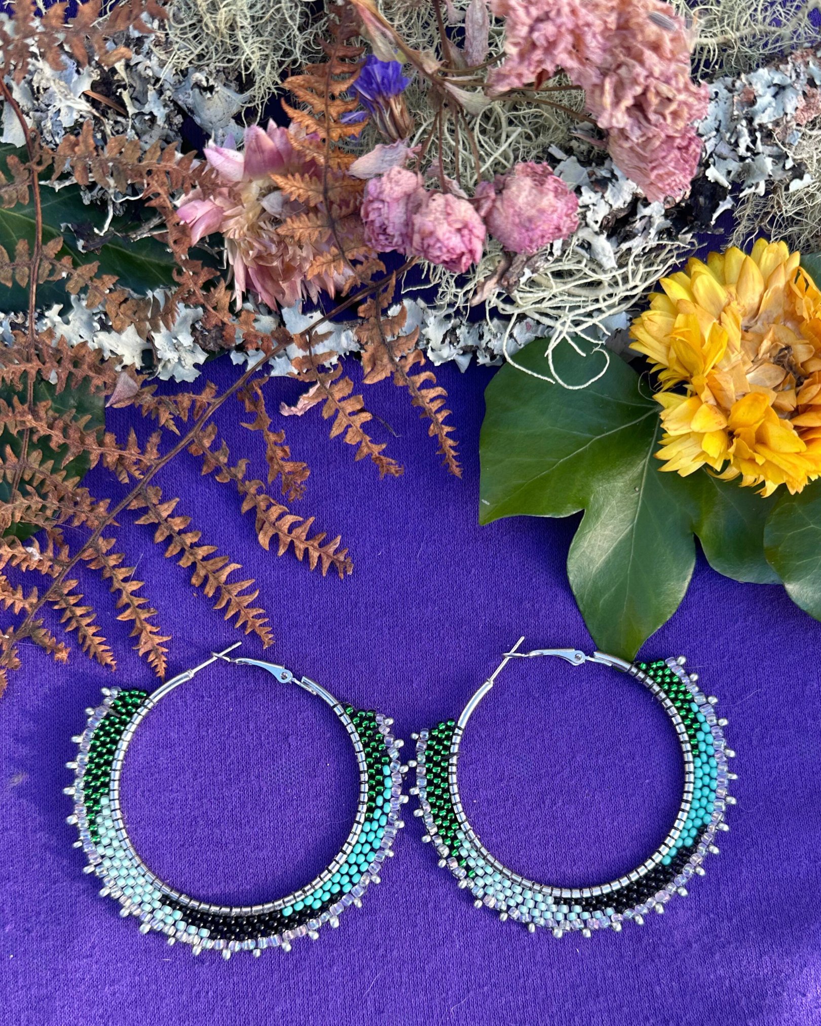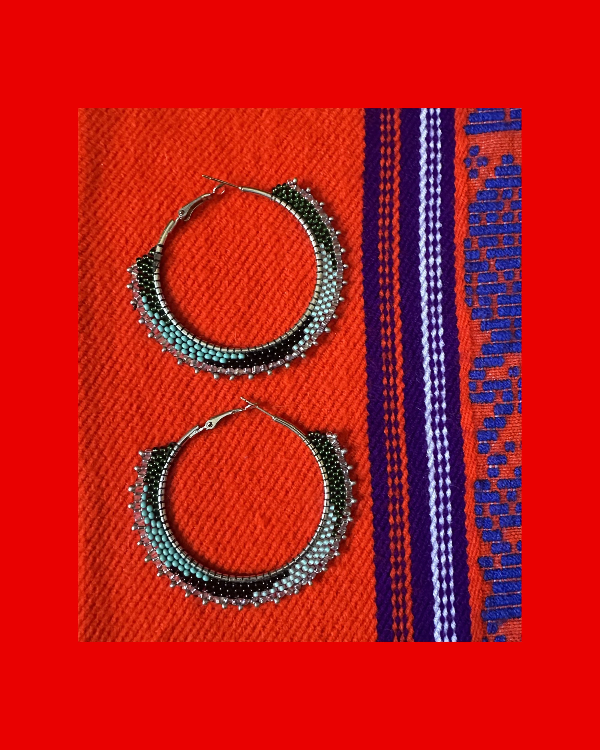 Keep the town folk whispering in these beaded hoops with greens, black, and teal