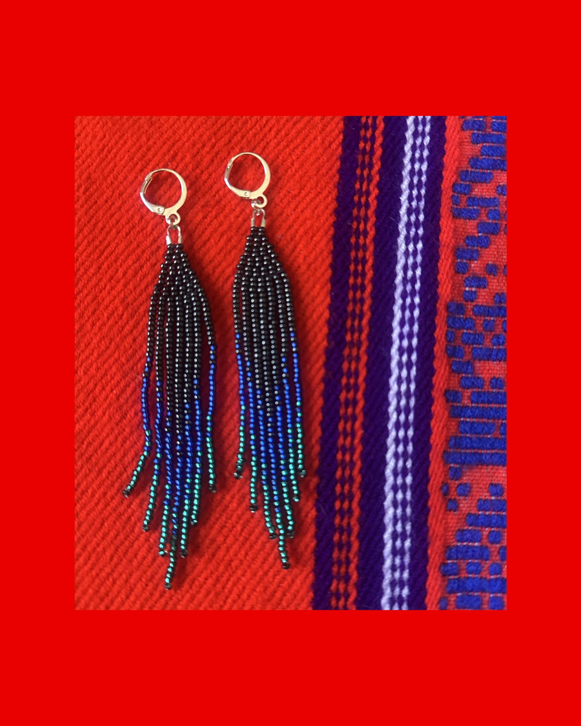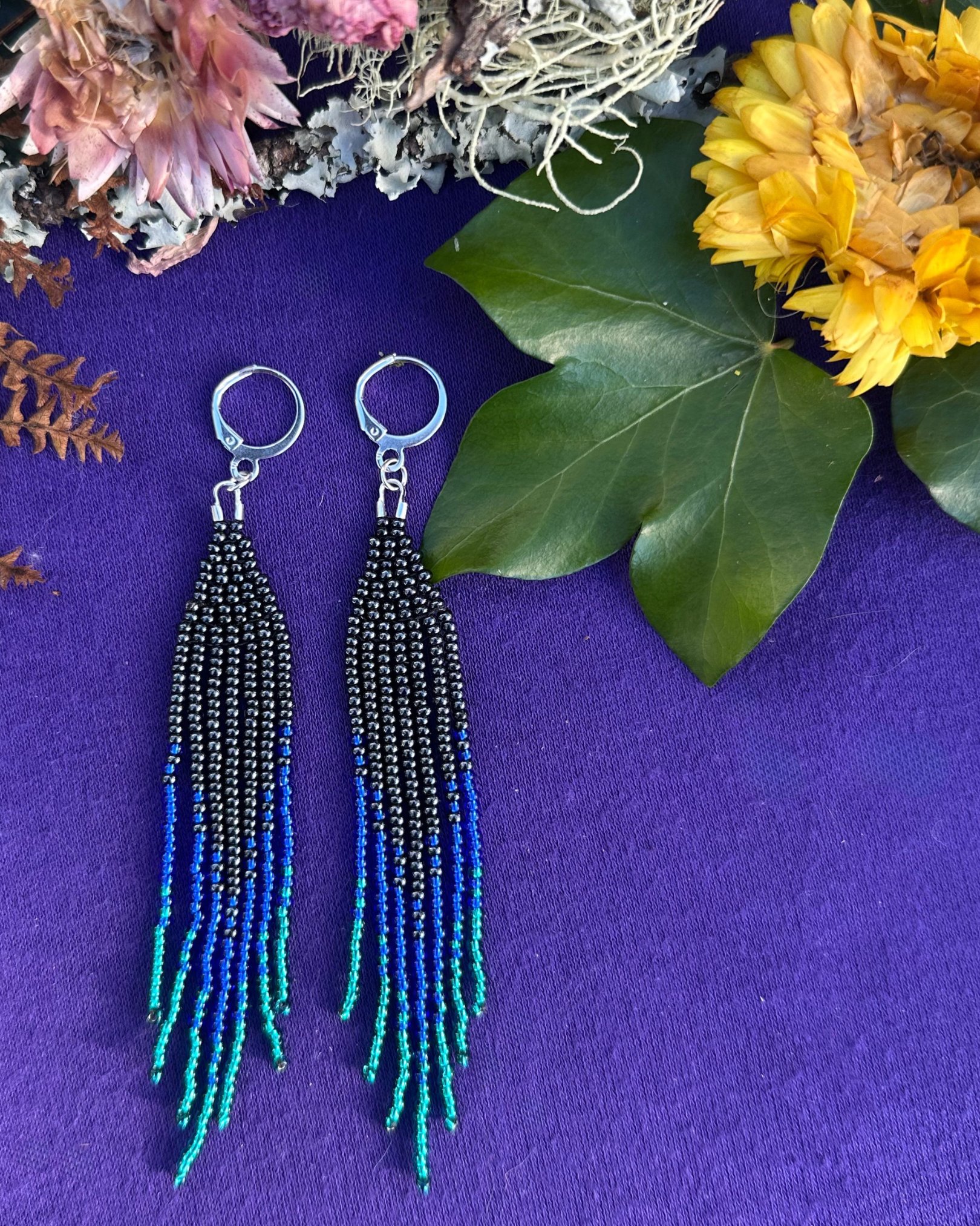 Finish your look with these classic fringe earrings in pearly black and shimmering teal and cobalt.