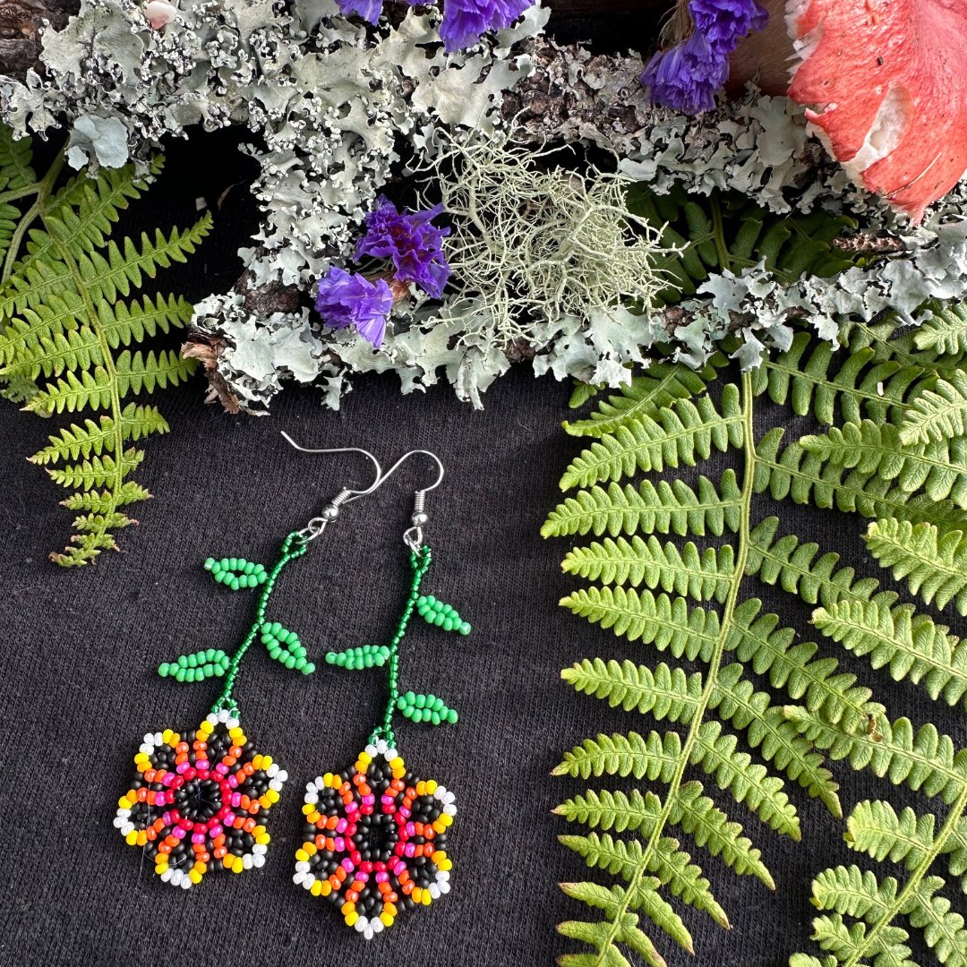 Huichol weaving style flowers in pink, yellow, and orange. 3 inches long.