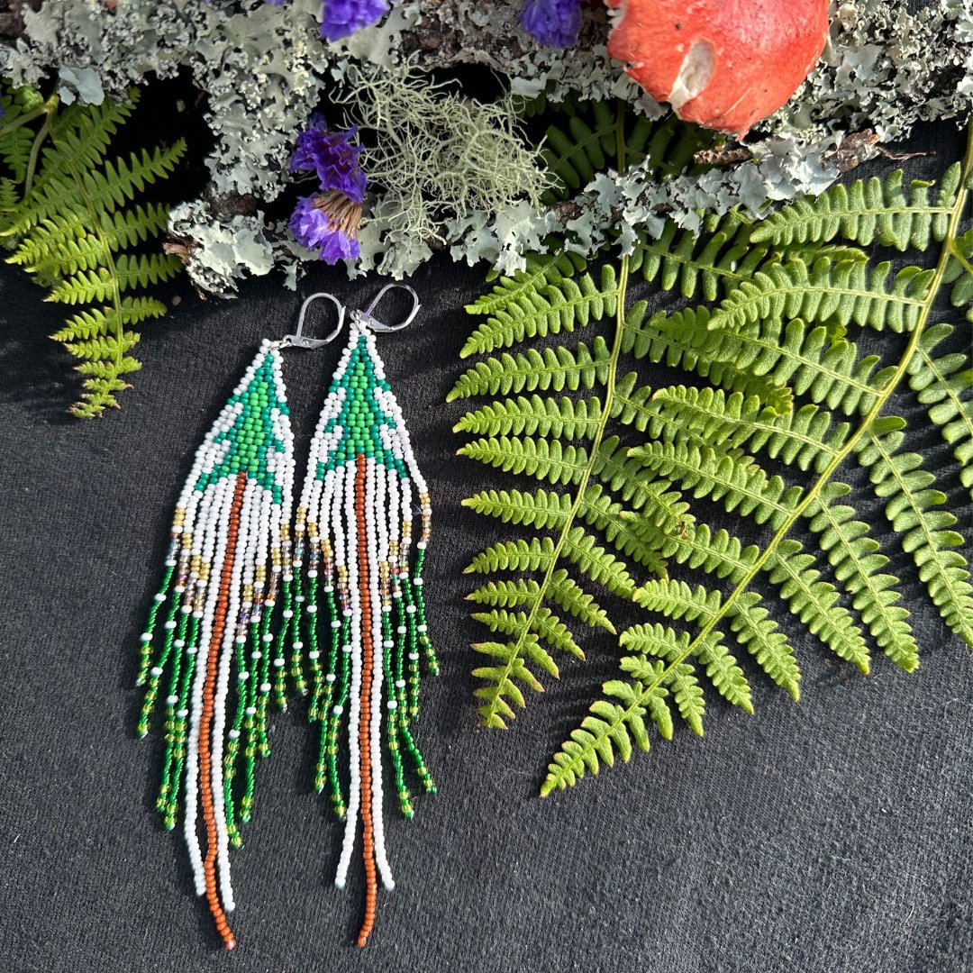 Shore pine fringe earrings in browns and greens and golds. 6 inches long.