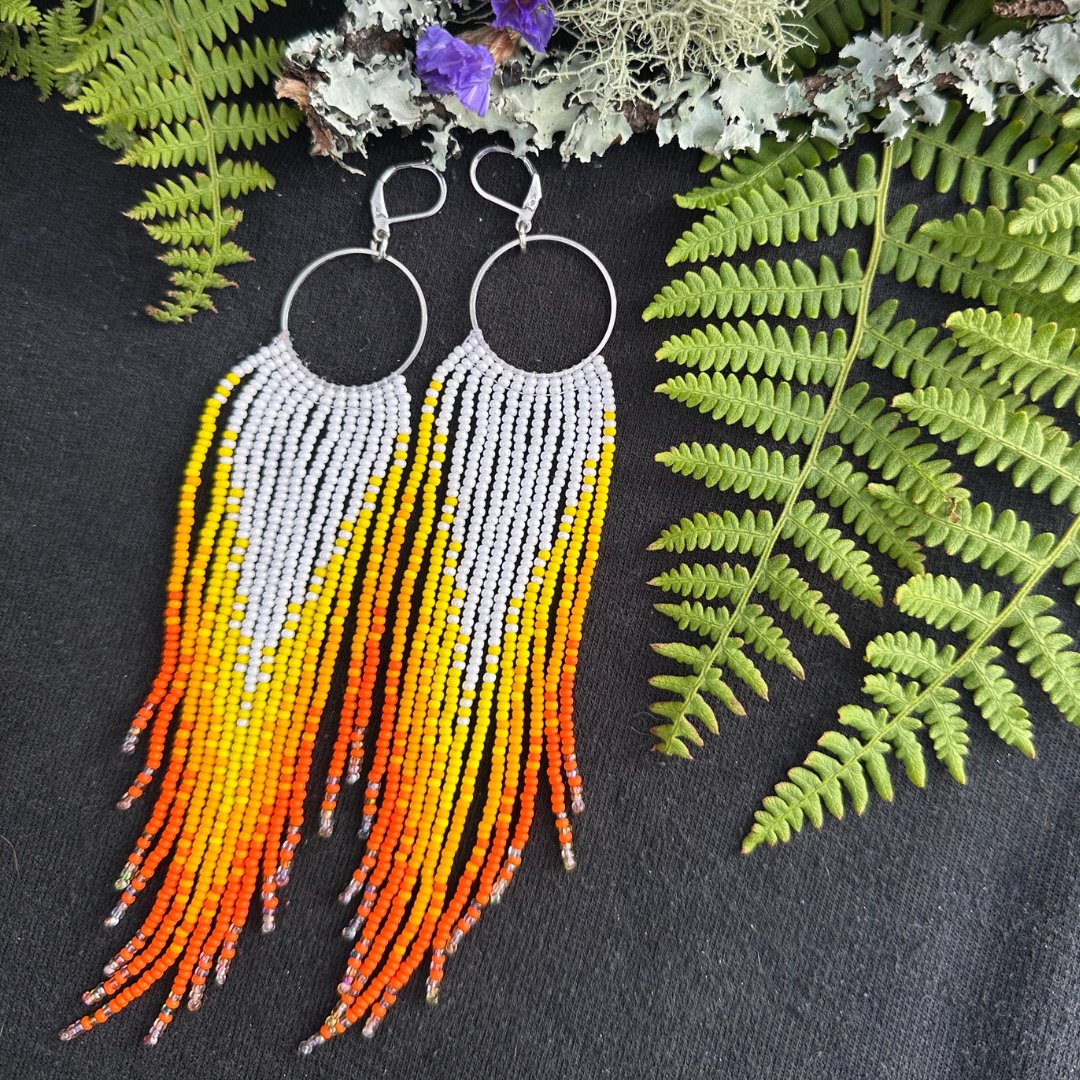 Yellow and orange ombre beaded fringe hoops. 6 inches long.