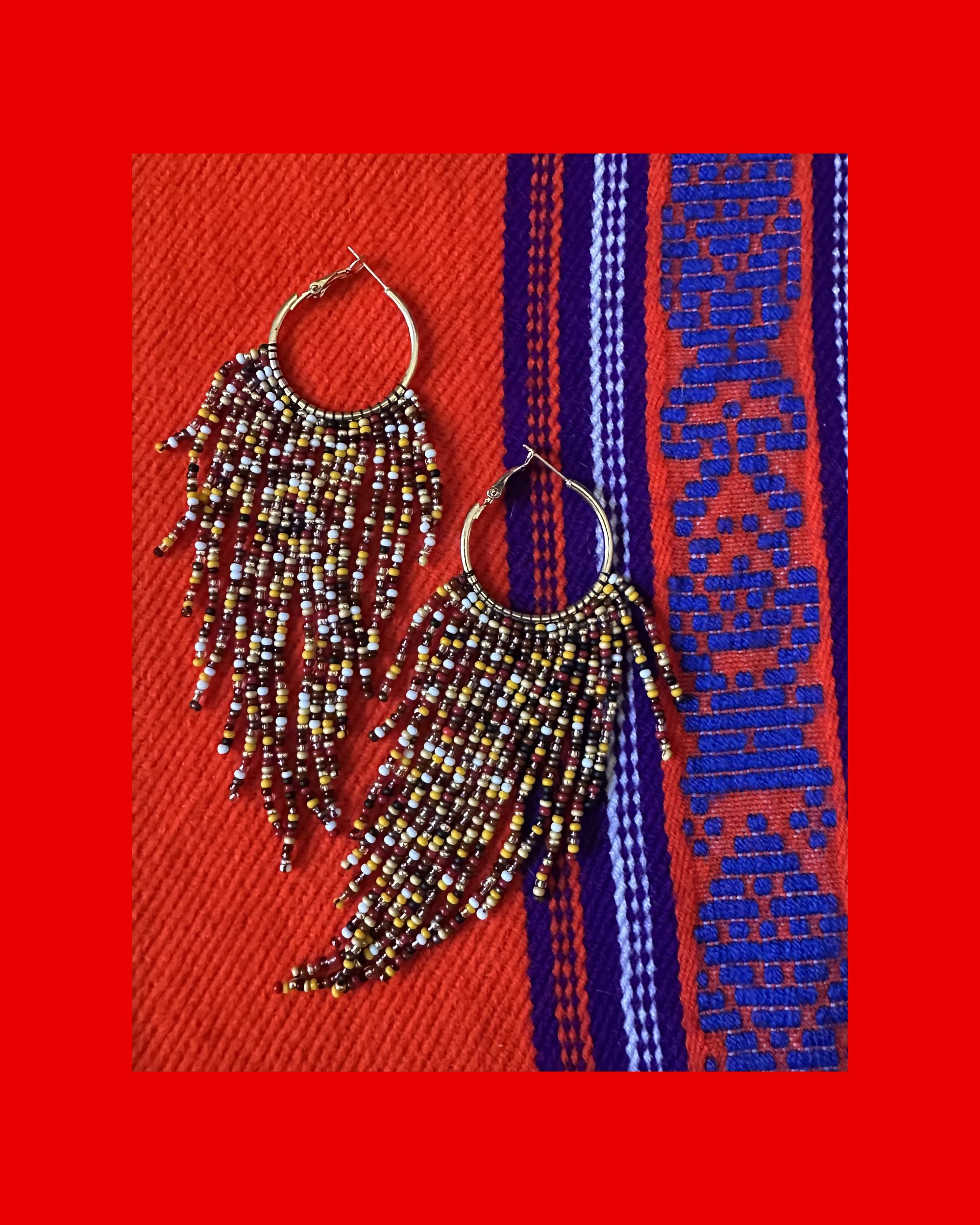 A mix of cream, black, browns, and golds on mini golden hoops.